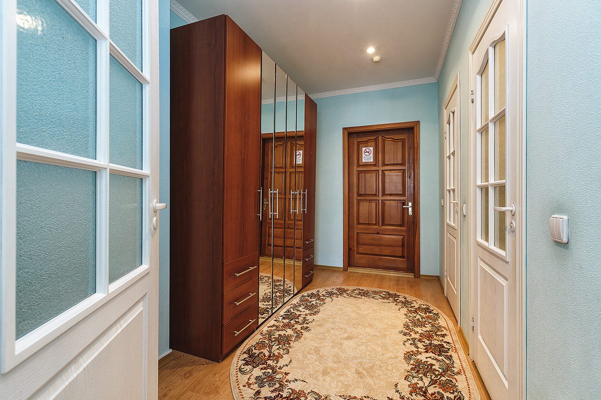 В номере: две односпальные кровати или рдна двуспальная, прикроватные тумбочки, шкаф, столик журнальный, туалетный столик, телевизор, телефон, чайник, холодильник, сушилка для белья